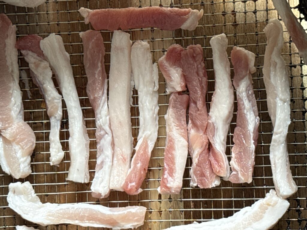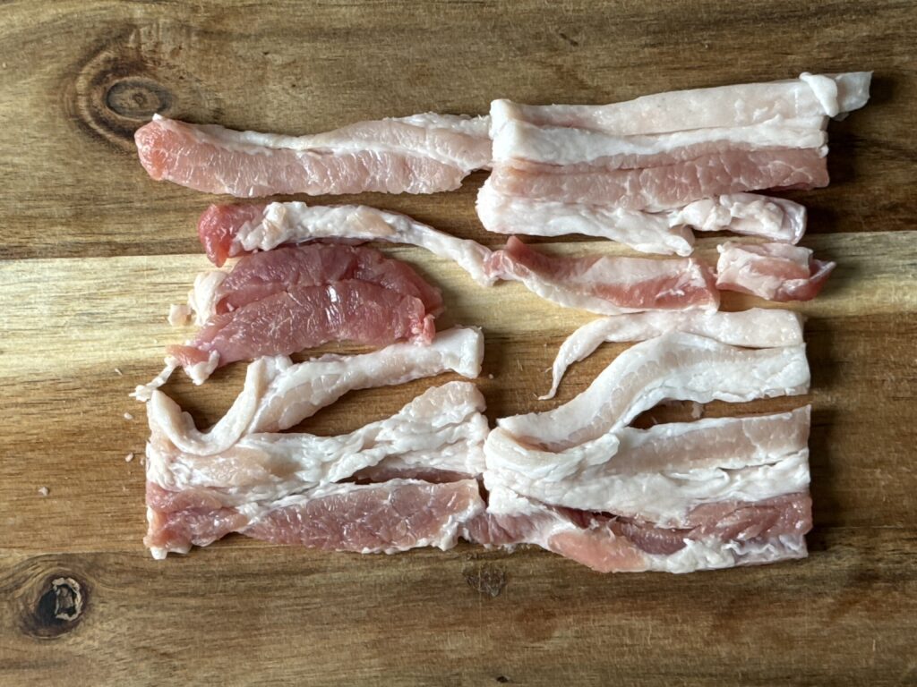 - Snijd de speklappen in dunne repen van ongeveer 1 cm breed.